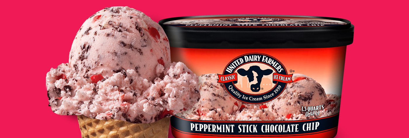 Our homemade chocolate chips add just the right amount of richness to our pink Peppermint ice cream with crunchy peppermint candies swirled throughout.